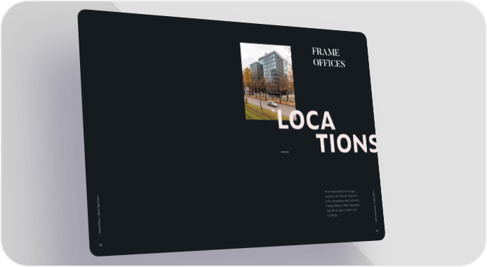 FRAME OFFICES LOCA TIONS - With nationwide coverage, F r ork - locations at Central Stations ame Of昀椀ces - Places that w and a growing urban network, Frame O昀케ces o昀昀ers business hubs for project teams and meetings. ame Of昀椀ces - Places that w ork - r - F 24 25