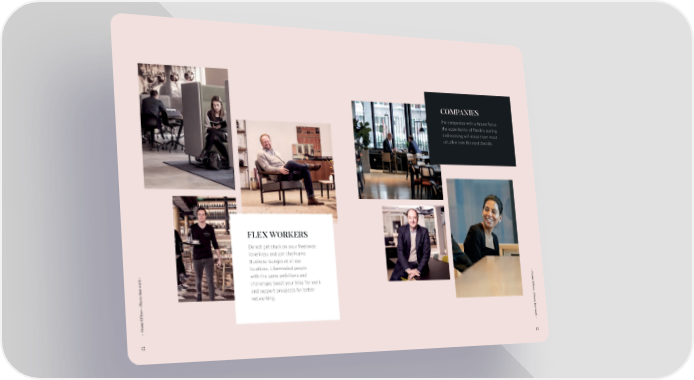 COMPANIES For companies with a future focus the opportunity of 昀氀exibly scaling and working will make them most valuable over the next decade. FLEX WORKERS Do not get stuck on your freelance loneliness and join the Frame Business lounges at all our locations. Likeminded people with the same ambitions and - F r ork - challenges boost your bliss for work ame Of昀椀ces - Places that w and support prospects for better networking. ame Of昀椀ces - Places that w ork - r F - 12 13