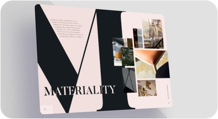 Materiality, design, and performance layer together in inspiring workplaces. Informal, authentic and remarkable spaces are creating workplaces where people want to gather, collaborate, and perform at their best. The choices of materiality help them think better and support their ability to solve problems. Materiality matters. - F r MATERIALITY ame Of昀椀ces - Places that w ork - 42 43 M